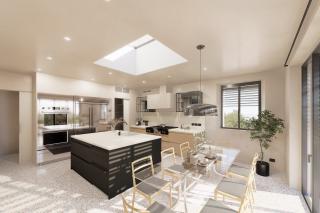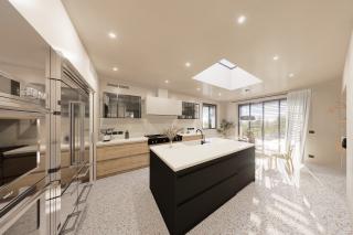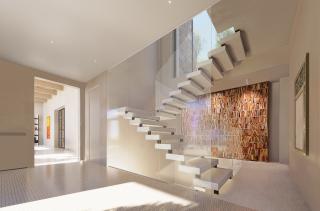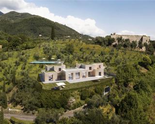 We are exactly above Pietrasanta and the view extends to the pine forests and then to the sea. On the left not too far away, there is the Rocca di Sala with its “cavernous limestoneā ashlar walls - a firm, ancient, untouchable presence that conveys a strong defensive character; yet, the texture of its masonries, the earthy colors of the cavernous limestone oxidized by time convey to us something closely related to the nature and material of the place. The choice of pale brown travertine cladding (Travertino S.Peter or Ascolano) seemed to juxtapose with the country walls and the tone of the Rocca in a natural way. The volumes of the house are arranged on the ground avoiding the need to build a closed block on the hillside but allowing air and light to enter the building. It is surprising to think that this is also a technique of good plant cultivation, i.e., olive trees, citrus trees, - wisely pruning the inside of the plant to let in air and light.